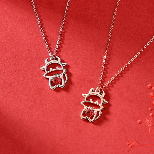 Cute Red CZ Hollow Chinese Zodiac Cattle 925 Sterling Silver Necklace