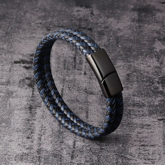 MKENDN Classic Blue Braided Leather Bracelet with Stainless Steel Magnetic Buckle