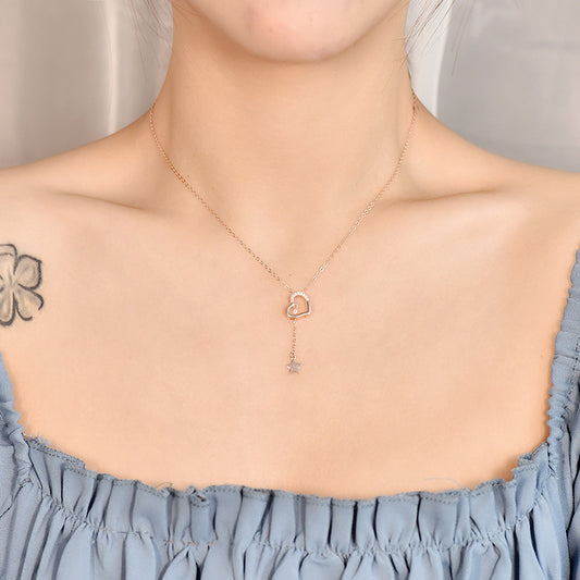 Sweet CZ Hollow Heart Star Tassels 925 Sterling Silver Necklace