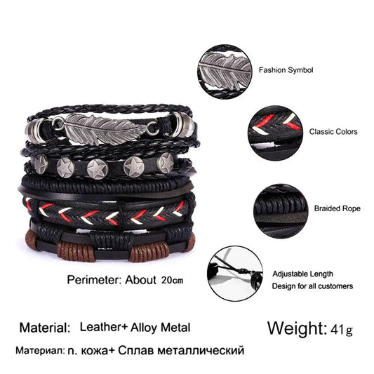 4PCS/SET Vintage Leaf Pendant Rice Beads Adjustable Rope Chain Bracelet