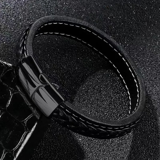 Classic Single-Layer Black Leather Bracelet with Magnetic Clasp