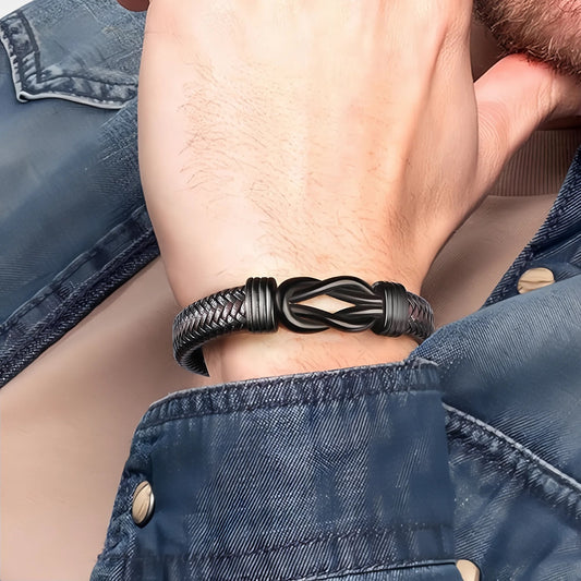 Men's Woven Genuine Leather Infinity Bracelet with Stainless Steel Charm – Fashionable Gift for Couples