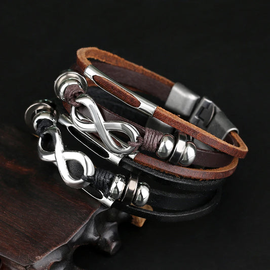 Multi-Layer Men’s Leather Bracelet with Stainless Steel Infinity Charm – Classic Fashion Jewelry Gift for Men