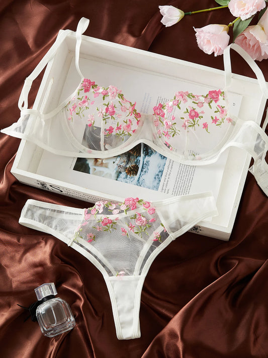 Semi-Sheer Floral Embroidered Bra & Panty Set – Elegant Sleepwear Lingerie