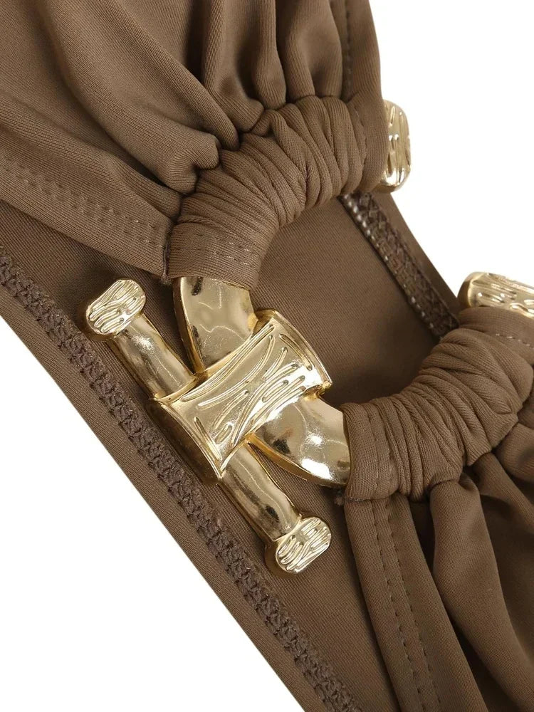 Solid O Ring Swimsuit for Women – Tie Side Shiny Ring Bandeau Bikini with Padded Bra Top